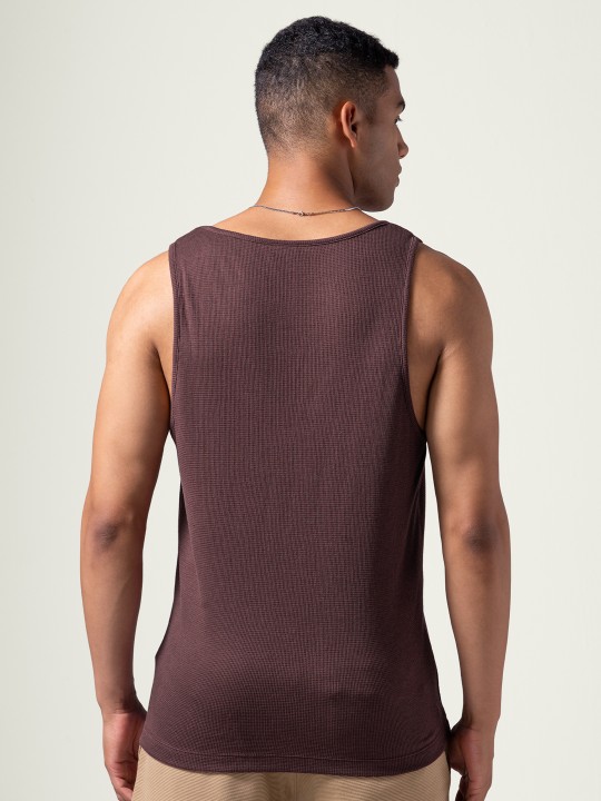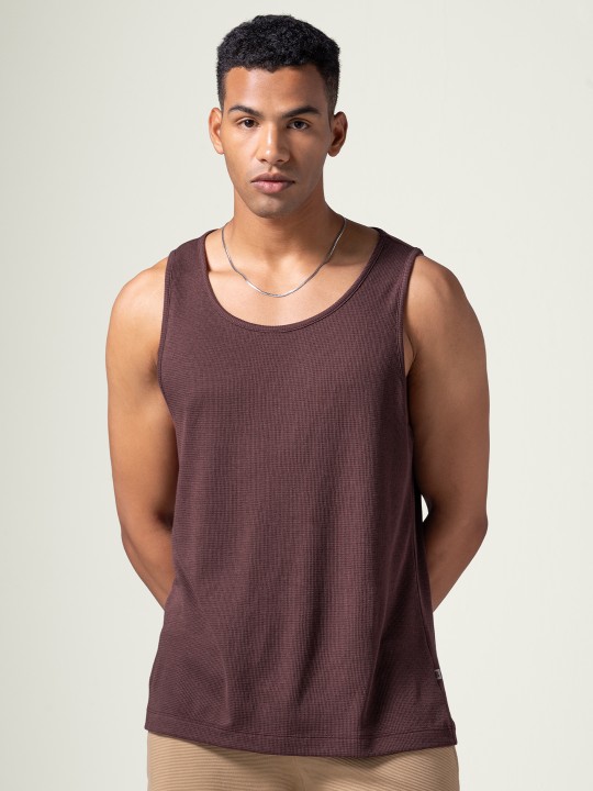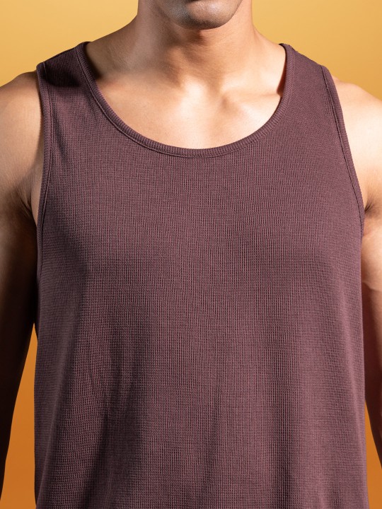 Maroon solid lounge t-shirt, has a round neck and sleeveless sleeves with slip-on closure.
