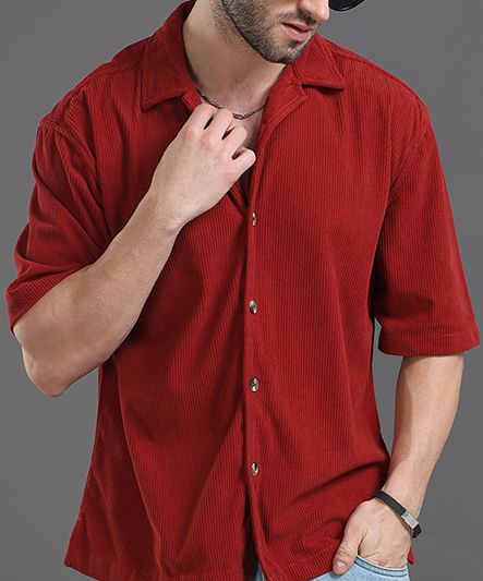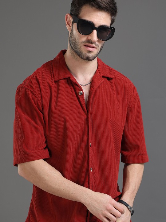 Maroon self design casual shirt ,has a cuban collar, short, regular sleeves, curved hem